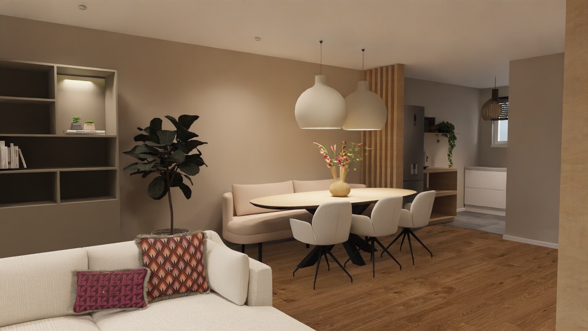 In deze ruime woning in Almkerk hebben we een harmonieus geheel gecreëerd tussen de woonkamer en eetkamer. Zachte kleuren, ronde vormen en natuurlijke materialen zorgen voor een warm, elegant interieur.