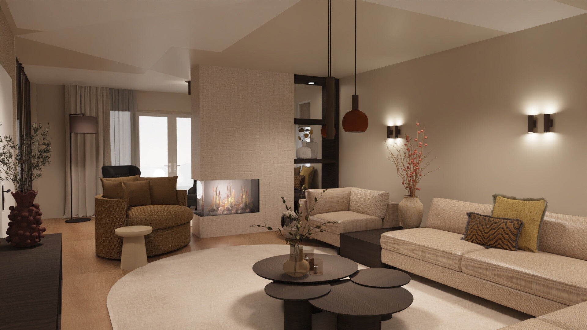 Voor deze moderne nieuwbouwwoning in Wijk en Aalburg mochten wij het interieurontwerp realiseren van een warme, sfeervolle woonkamer.